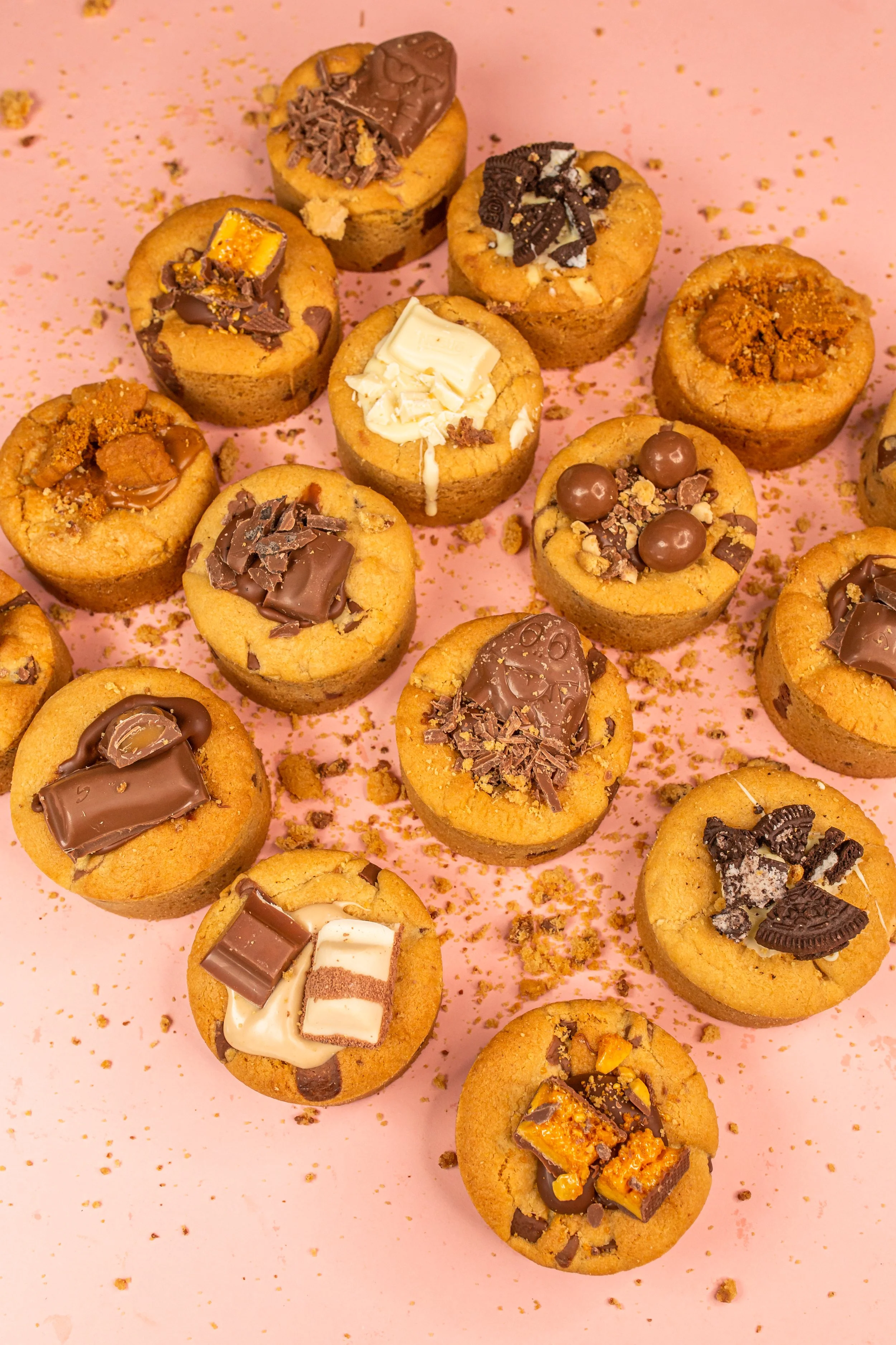 We use our signature chocolate chip cookie recipe to make cups, fill them & top them with a choice of flavours and there you have it- a deep dish cookie!